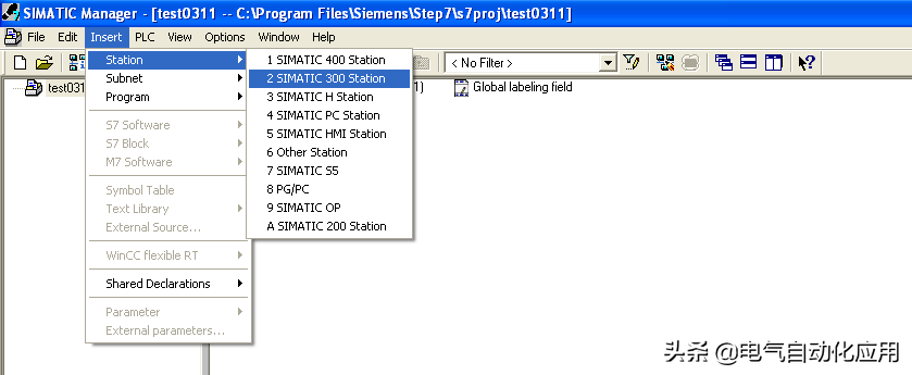 在STEP7中新建项目,点击Insert-Station-2. Simatic 300 Station