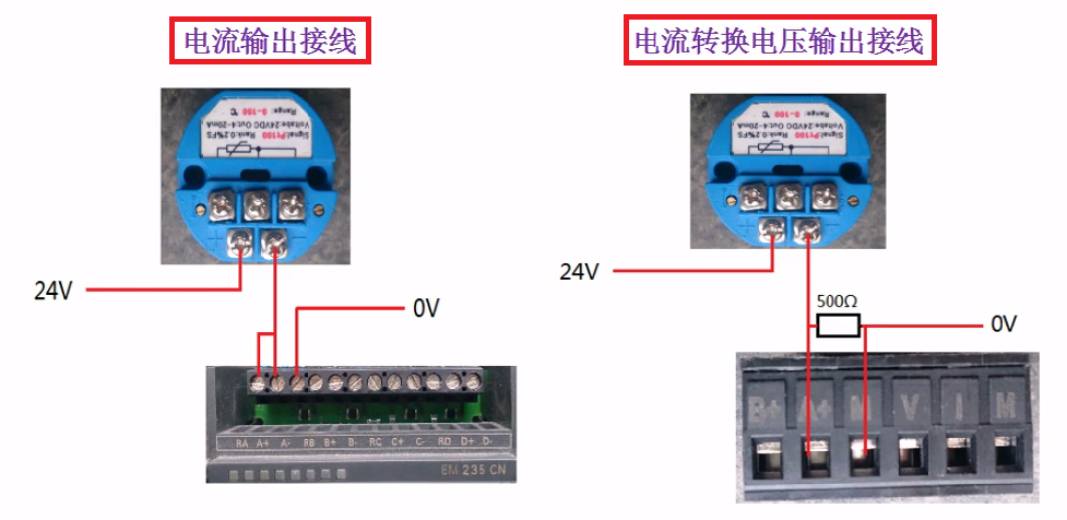 在A+与M之间,并联一个500欧姆的电阻,这时由于变送器的输出是电流值,则PLC相当于一个电压表,量取的是电阻两端的电压值,取值后进行控制操作。