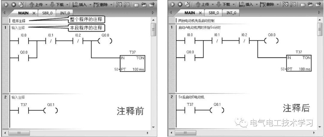 梯形图程序是由一个个指令元件连接起来组成的,对指令元件进行注释有助于读懂程序段和整个程序,指令元件注释可使用符号表。