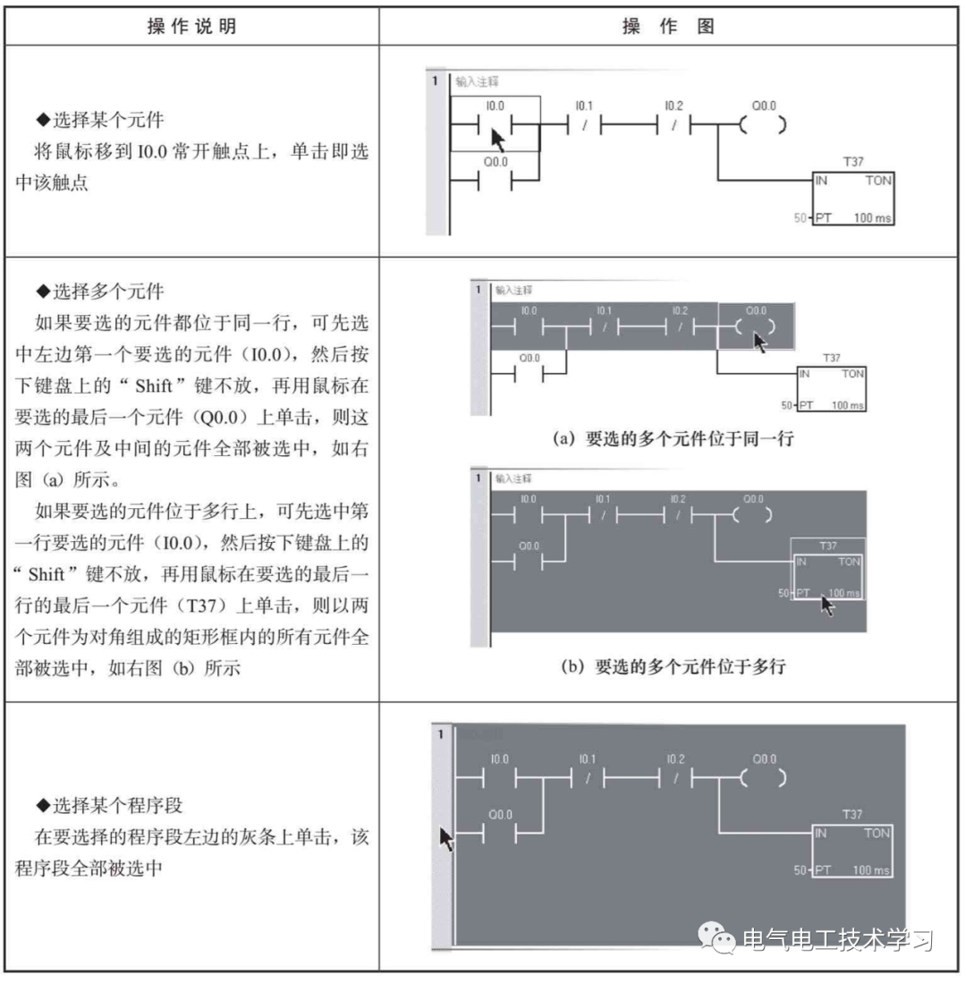 在对程序进行编辑时,需要选择编辑的对象,再进行复制、粘贴、删除和插入等操作。STEP 7-Micro/WIN SMART软件的一些常用选择操作见表1。