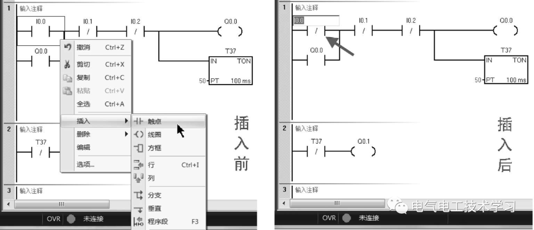 在软件处于插入模式(INS)时进行插入元件操作,会在光标所在的元件之前插入一个新元件。如图2所示,软件窗口下方状态栏出现“INS”,表示当前处于插入模式,用光标选中I0.0常开触点,再用右键快捷菜单进行插入触点操作,会在I0.0常开触点之前插入一个新的常开触点。