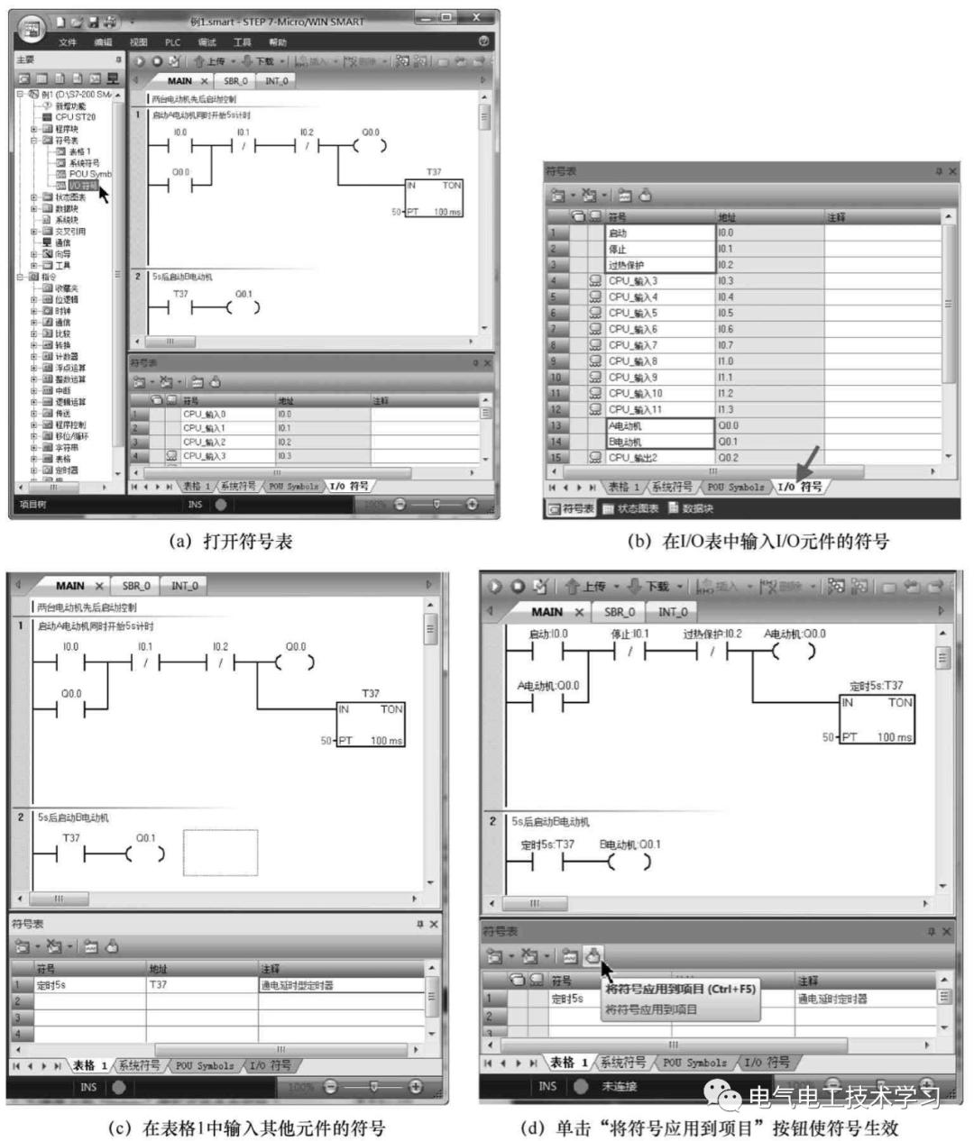 在“地址”栏输入“T37”,在“符号”栏输入“定时5s”,注意不能输入“5s定时”,因为符号不能以数字开头,如果输入的符号为带下波浪线的红色文字,则表示该符号有语法错误。在符号表中给需要注释的元件输入符号后,单击符号表上方的“将符号应用到项目”按钮,如图5(d)所示,程序中的元件旁马上出现符号。