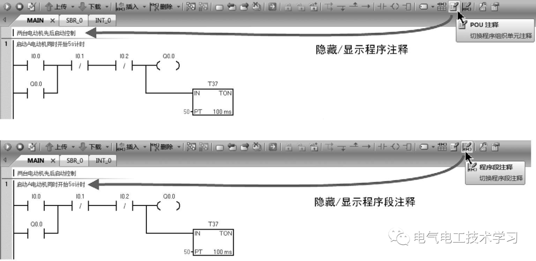 比如,I0.0常开触点显示“启动:I0.0”,其中“启动”为符号(也即元件注释),“I0.0”为触点的绝对地址(或称元件编号)。如果元件旁未显示符号,可单击菜单栏中的“视图”,在横向条形菜单中选择“符号:绝对地址”,即可使程序中元件旁同时显示绝对地址和符号;如果选择“符号”,则只显示符号,不会显示绝对地址。