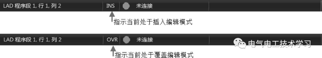 STEP 7-Micro/WIN SMART软件有插入(INS)和覆盖(OVR)两种编辑模式,在软件窗口的状态栏可以查看当前的编辑模式,如图1所示。按键盘上的“Insert”键可以切换当前的编辑模式,默认处于插入模式。