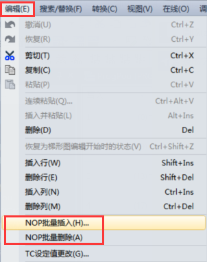 在编辑菜单下,有NOP批量插入和NOP批量删除。插入或删除NOP,可以调整程序的步号。通过NOP指令进行的步号更改会在程序转换后被反映到梯形图编辑器。