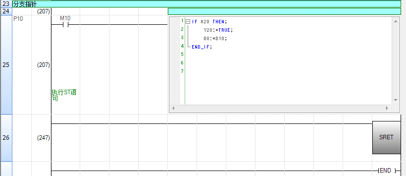 内嵌ST是指在梯形图编辑器中相当于线圈的指令单元格中,创建用于显示ST程序的内嵌ST框,并进行编辑/监视的功能。因此,可以简单地在梯形图程序中创建数值运算及字符串处理。内嵌ST框中最多可以输入2048个字符。我们在梯形图输入对话框中输入 “STB”,可以插入内嵌ST框,接着就可以编辑ST程序了。