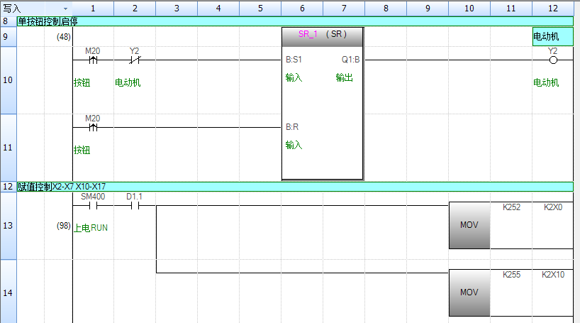 (4) 程序的编写按照从左至右、自上至下的顺序排列。一个梯级开始于左母线,终止于右母线,线圈与右母线直接相连。
