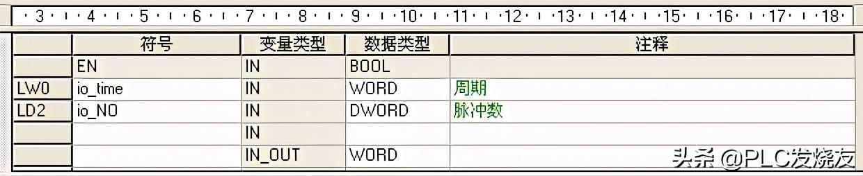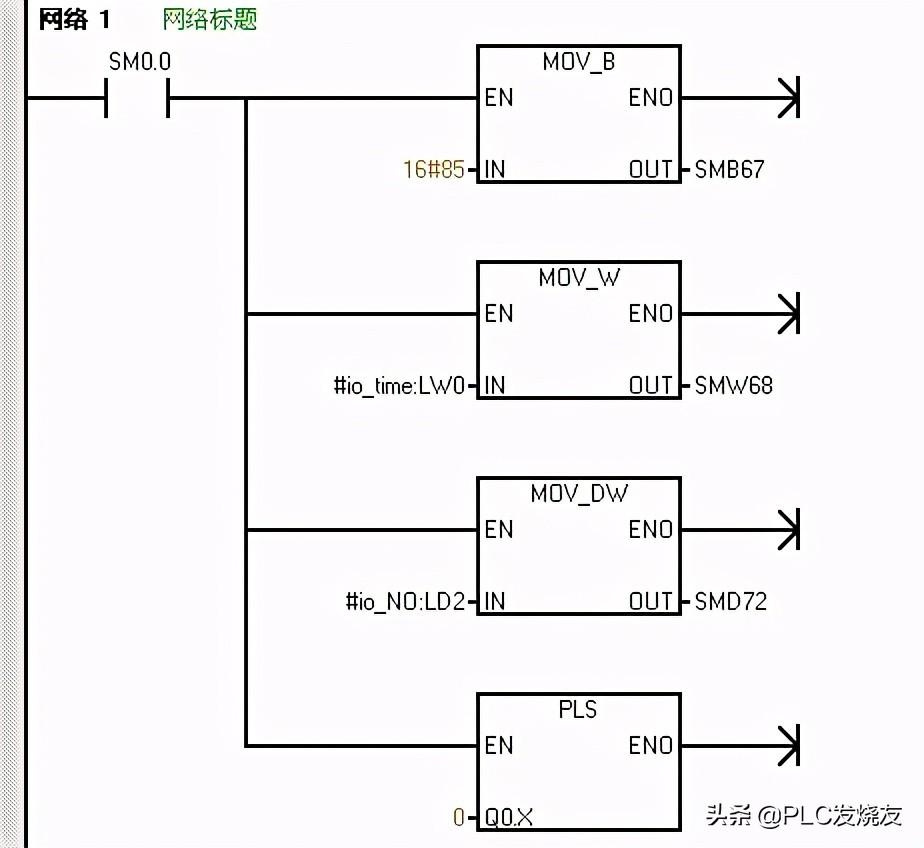 而在高速脉冲输出子程序里面,我们定义一下接口,定义周期io_time为LW0,为IN类型的,定义脉冲数io_NO为LD2,也是为IN类型的,然后写子程序。首先传送16#85到SMB67中定义控制字节,这里选择的是PTO模式、单段、1us/周期、装入周期和脉冲数的情况(控制字节的定义可以参考PTO/PWM控制字节表),并传送LW0到SMW68中写入周期值,传送LD2到SMD72中写入脉冲数,最后执行PLS指令。那么这样是做了一个带功能参数的子程序,之后在主程序中可以对这个带功能参数的子程序进行调用。