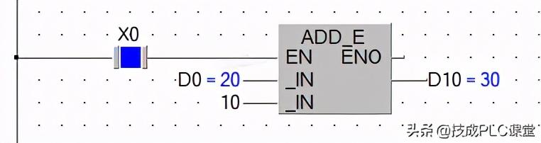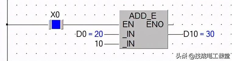 它可以通过功能指令实现,也可以运用功能块实现。如下图27-5所示为功能指令形式,X0接通,(D0)=K20,执行ADD指令后,D10的当前值为“和”K30。