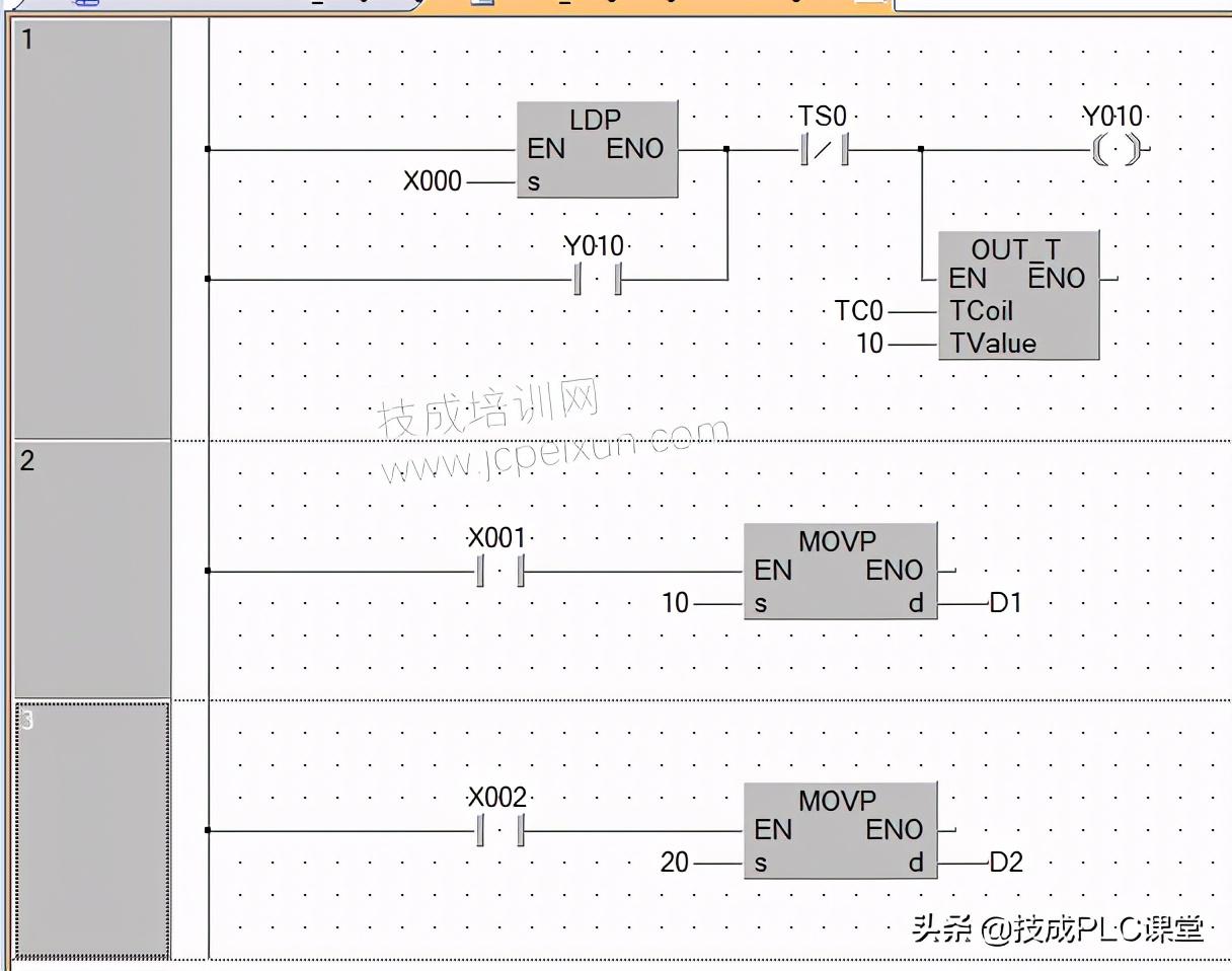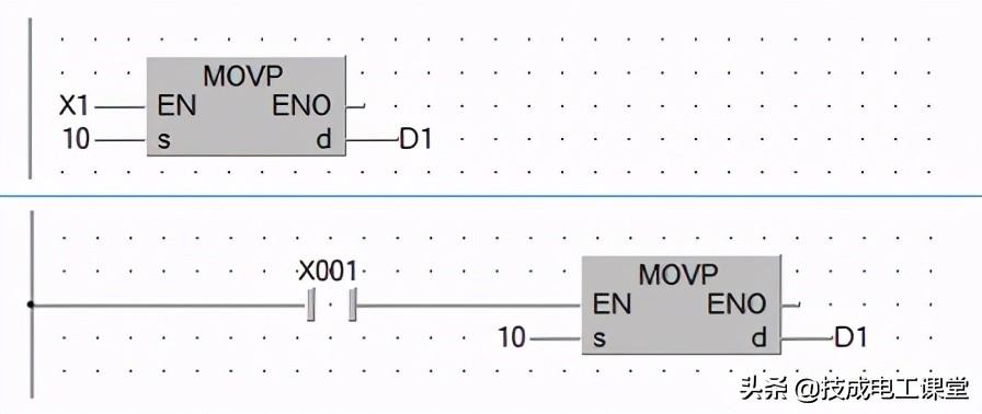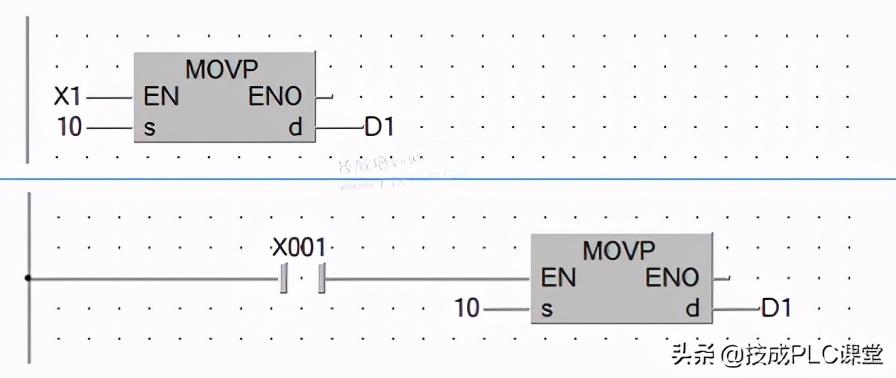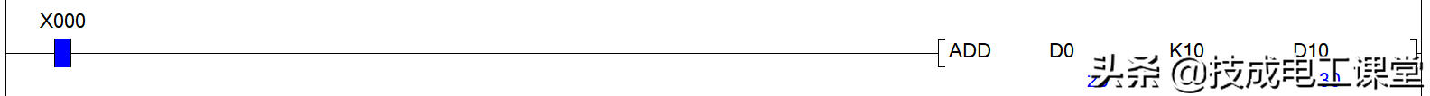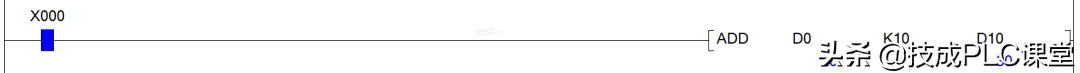 而功能块和功能指令,若是对于一般的功能而言,其实两者区别不大,例如我们要实现两个数的相加:当驱动条件X0成立时,把D0的当前值加上K10,结果保存到D10中。