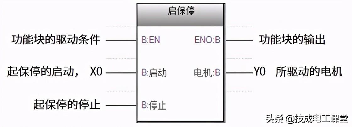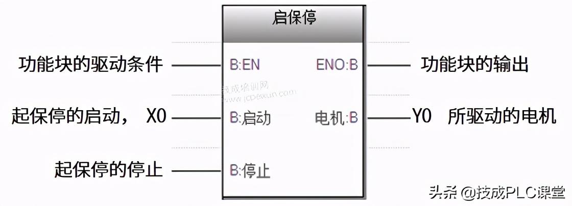 例如电机的起保停程序,我们可以把整个起保停程序打包成一个功能块,如下图27-2所示,该功能块的输入输出、起保停的启动、停止和电机都以标签的形式定义,直到被调用时再由用户指定具体的软元件,如起保停的启动用“X0”、电机用“Y0”等。