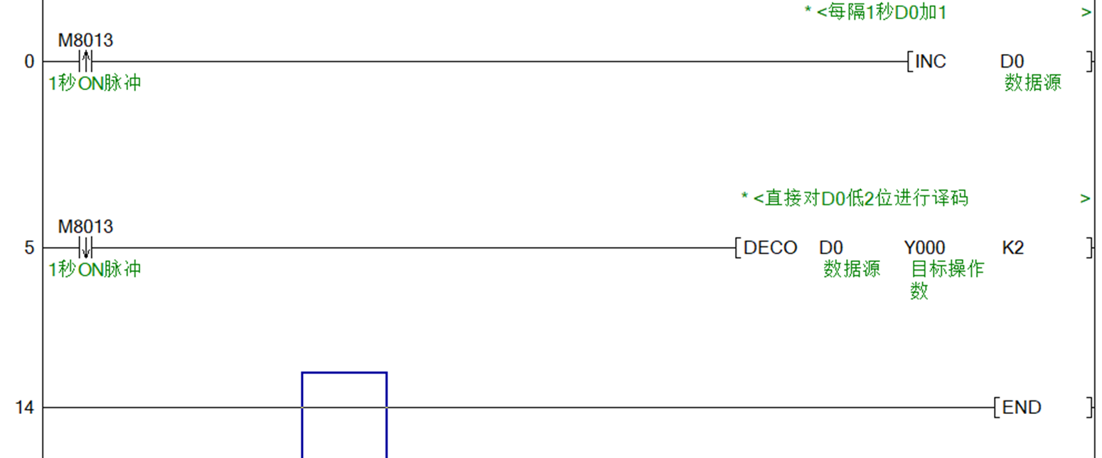 程序解释说明: 通过三菱PLC内部1秒脉冲寄存器M8013实现定时功能,在秒脉冲产生的上升沿使D0寄存器加1;在秒脉冲的下降沿,接通译码指令DECO;Y0,Y1,Y2,Y3四个位控制着四种颜色彩灯,译码指令接通时,只会使得其中一个位置ON;