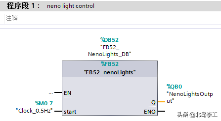回到本文的控制任务,我们编写功能块FB52_NenoLights,它有一个输入信号start和输出值Q,其中: