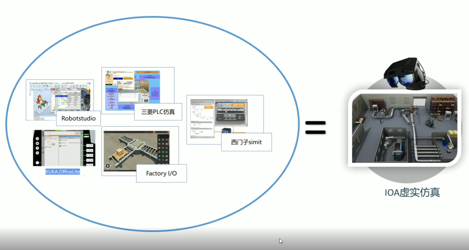 IOA虚拟仿真支持PC、手机以AR眼镜互动,通过以太网扩展,它兼容了PLC系统,单片机系统,工业机器人控制器,运动控制器,以及扩展的计算机软件仿真,如机器视觉等。
