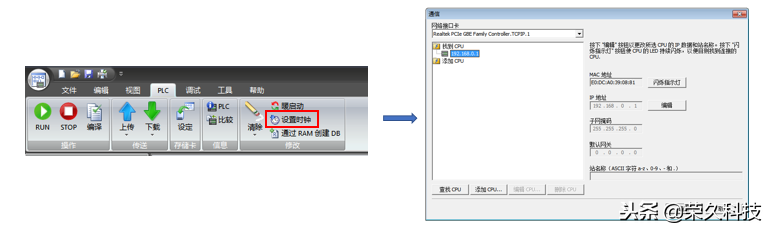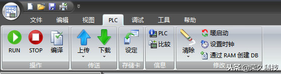 “PLC”菜单包含的主要功能是对在线连接的S7-200 SMART CPU的操作和控制,比如控制CPU的运行状态、编译和传送项目文件、清除CPU中项目文件、比较离线和在线的项目程序、读取PLC信息以及修改CPU的实时时钟如下图所示: