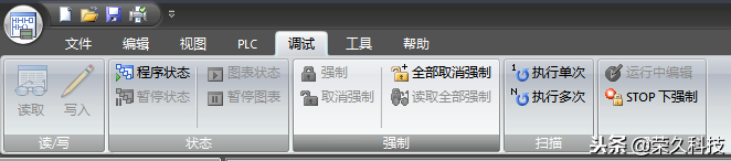 调试”菜单的主要功能是在线连接CPU后,对CPU中的数据进行读/写和强制对程序分运行状态进行监控。这里的“执行单次”和“执行多次”的扫描功能是指CPU从停止状态开始执行一个扫描周期或者多个扫描周期后自动进入停止状态,常用于对程序的单步或多步调试,如下图所示: