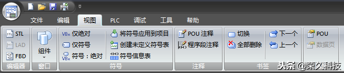 “视图”菜单包含的功能有程序编辑语言的切换、不同组件之间的切换显示、符号表和符号寻址优先级的修改、书签的使用,以及打开POU和数据页属性的快捷方式,如下图所示: