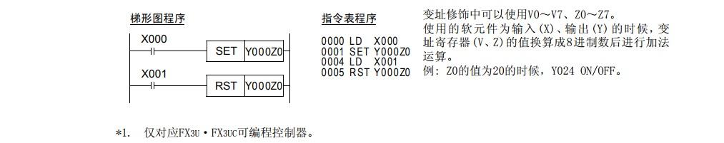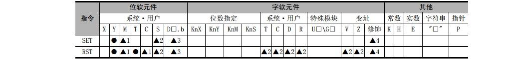 SET指令和RST指令中使用的软元件,可以采用变址寄存器(V、Z)进行修饰。 (状态(S)、特殊辅助继电器(M)、32位计数器(C)、D□.b、字软元件不能修饰。)