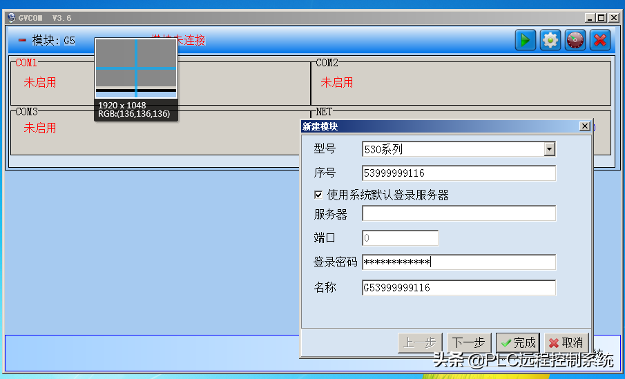 1.电脑端安装GVCOM3软件。新建GRM模块,输入模块的序号如下图(模块序号是唯一的识别标志),与模块密码。