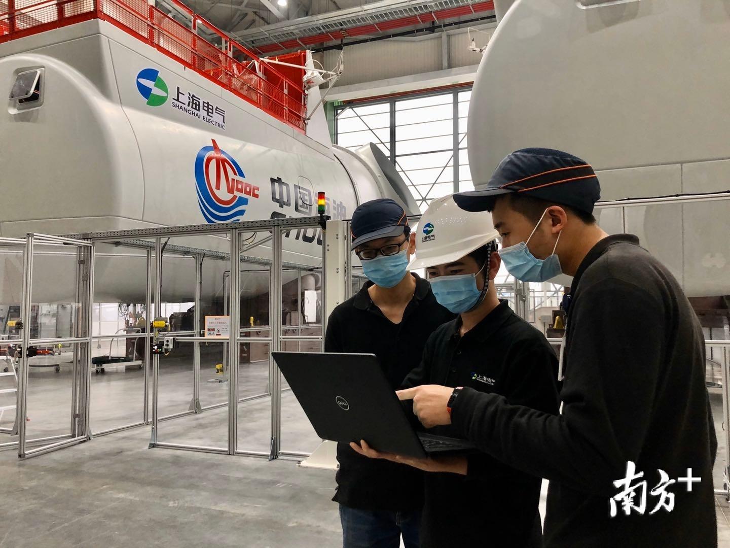 当记者在上海电气广东海上风电智能制造基地(以下称“上海电气风电汕头基地”)见到风机测试工程师蔡雄杰时,他正和几名测试员对风机进行整机集成测试。他们身后,两台巨型的风机惹人注目。这是上海电气风电汕头基地即将交付给业主的风机,功率为6.25兆瓦。