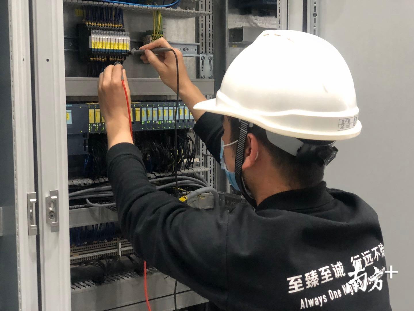 蔡雄杰对配电柜线路进行测试。余丹 摄