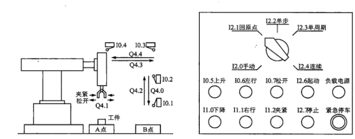如上图,机械手用来将工件从A运到B,操作面板如右图所示,Q4.1控制加紧电磁阀,为1时加紧工件,工作方式选择开关有5个位置,操作面板的6按钮是手动按钮,为保证在紧急情况下能可靠的切断PLC的负载电源,设置了交流接触器KM(如下图所示),运行时按下负载电源按钮,使KM线圈得电并自锁,KM的主触点接通,给外部负载提供电源,当紧急情况时,按下紧急停车按钮来断开电源。