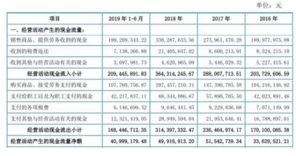 2016年至2019年6月30日,公司经营活动产生的现金流量净额分别为3362.95万元、5154.27万元、4991.69万元、4099.92万元。