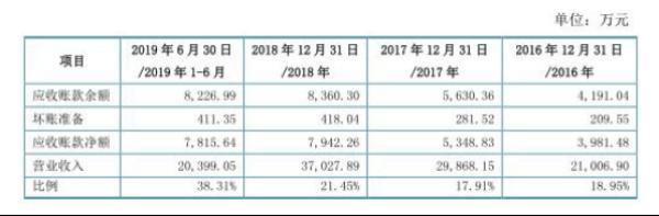 2016年至2019年6月30日,四会富仕应收账款余额分别为4191.04万元、5630.36万元、8360.30万元、8226.99万元,应收账款净额分别为3981.48万元、5348.83万元、7942.26万元、7815.64万元,占营业收入的比重分别为18.95%、17.91%、21.45%及38.31%。