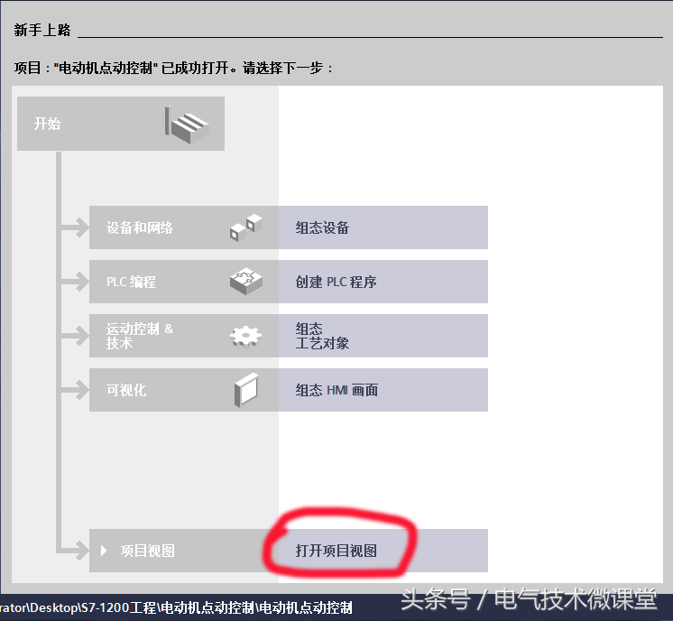 第四步:这时候会弹出一个新的菜单,在此菜单中既可以直接进行设备组态,也可以创建PLC程序,或是打开项目视图,选择最后一个“打开项目视图”,如果需要多个PLC进行组态,也可以后期在项目视图里去完成。