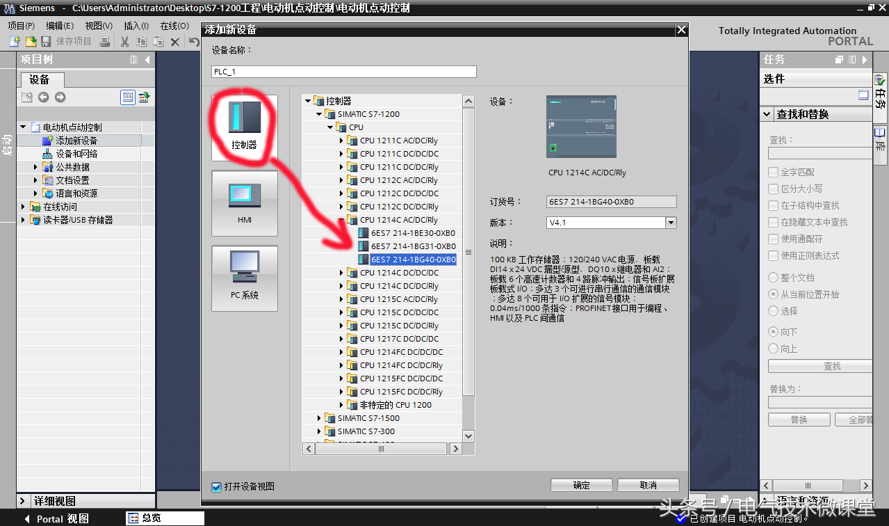 在新弹出的窗口中,左侧包括控制器、HMI、PC系统三个选项,因为要添加的是PLC设备,所以我们选择“控制器”,选择PLC的型号为CPU 1214C AC/DC/RLY,在下拉列表中进一步选择该PLC的订货号(PLC的订货号一般印刷在PLC本体上,是一个16位的字母与数字结合的串号,例如6ES7 214-1BG40-0XB0)。