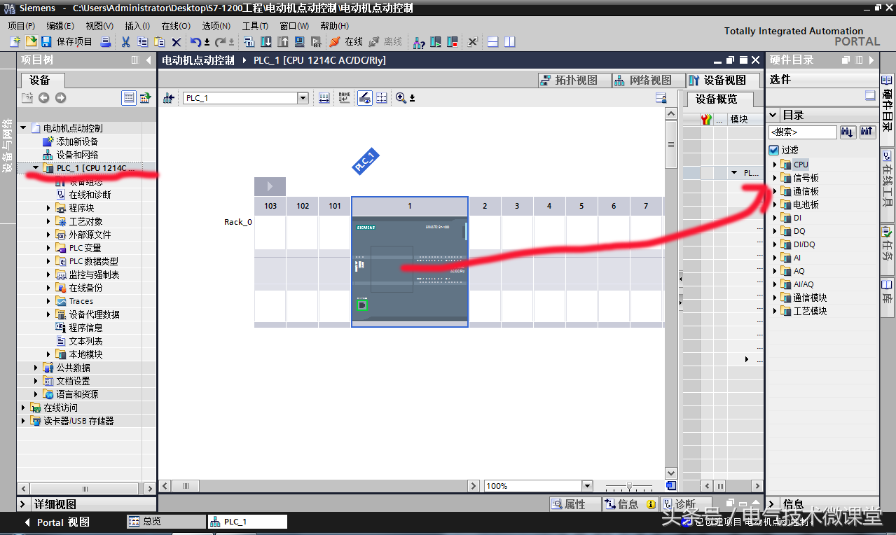 第六步:成功添加PLC设备之后,可以看到左边栏“项目树”中已经新增了一个"PLC_1"文件夹,该文件夹下还包含程序块、工艺对象、外部源文件、PLC变量等子目录。与此程序相关的所有文件都存储于这个项目文件夹中。