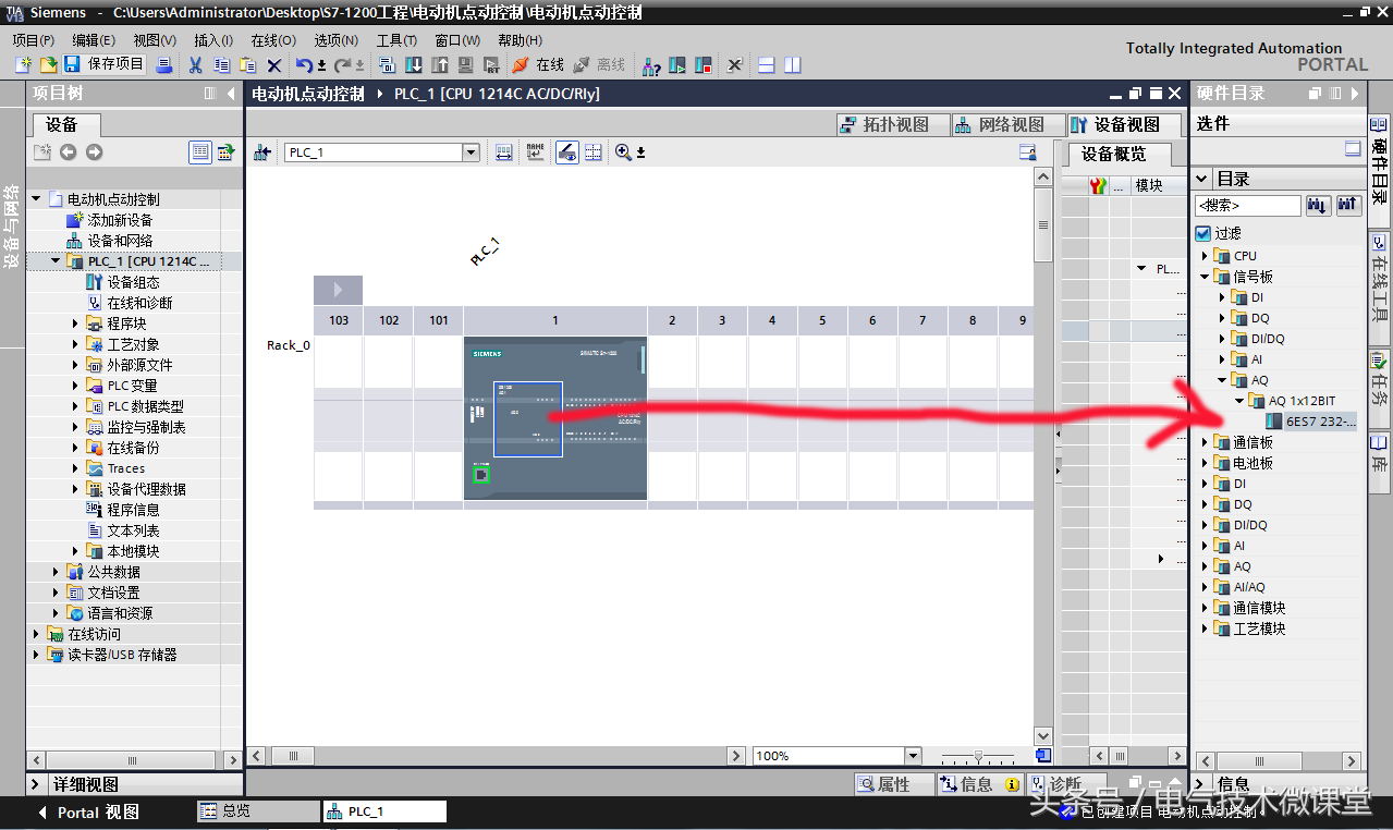 举一个例子,因为我所选择的1214型PLC是自带模拟量输入的,但是没有模拟量输出功能,所以这里我在PLC的信号板上添加了一个模拟量输出模块AQ。