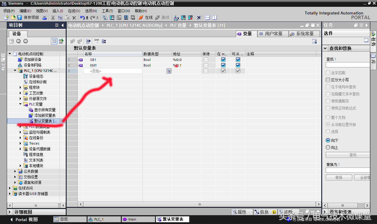 第七步:在完成了第六步的设备组态之后,还不能马上开始编写梯形图程序,我们要根据项目的具体控制要求来设定PLC的输入和输出变量。点击左边栏的PLC变量文件夹,双击打开下拉表中的“默认变量表”,依次输入变量的名称和地址来完成变量的设置。