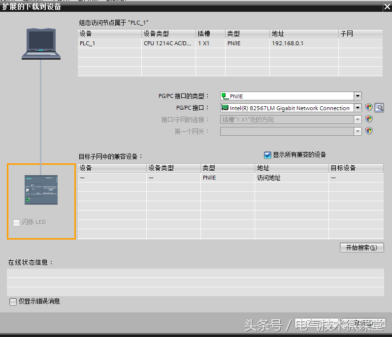 第十步:点击下载按钮,在弹出菜单中选择网卡接口,点击搜索按钮,软件会自动搜索到在线的PLC设备,点击完成下载,操作结束!