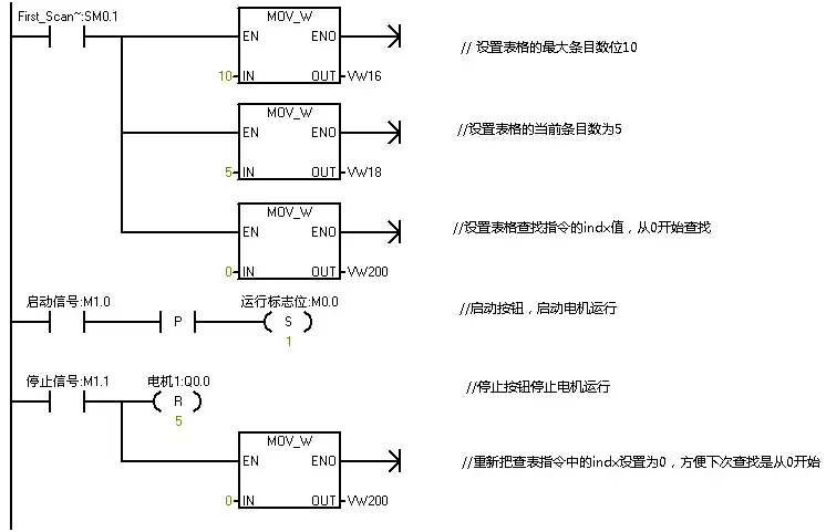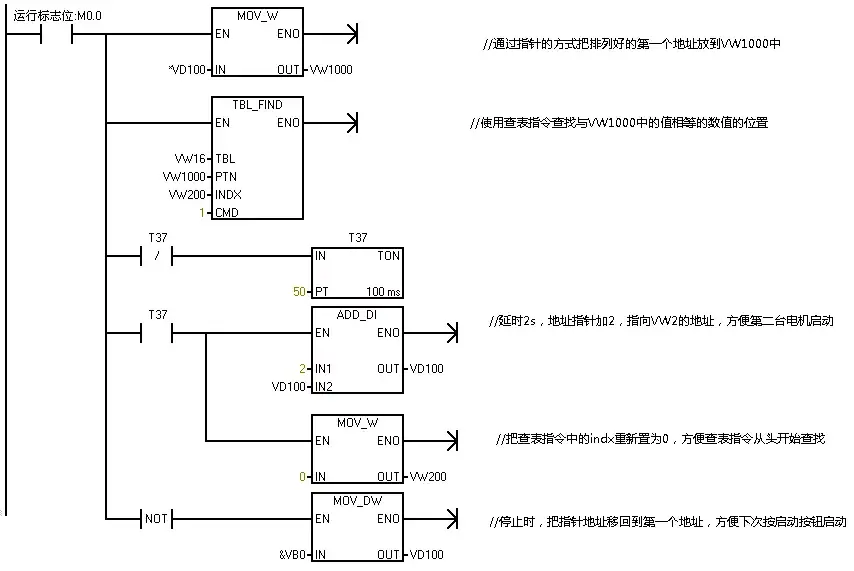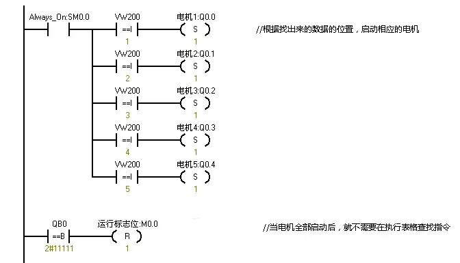 在这里面我们会用到两个功能,第一个功能时把我们电机运行的时间,按照编号顺序放到表格中,例如VW20到VW28分别表示电机1到电机5的运行时间,把它放到表格中,而后把我们排列好的数据,拿过来与表格中的数据进行比较(可以使用查表指令),看看最小的值时位于表格中的哪个位置,根据查表指令所查找的位置来启动那条电机,比如查找出来的值时3则表示的就是第三台电机的运行时间最少,可以启动这第三台电机,这里我们需要用到表格指令及间接寻址。