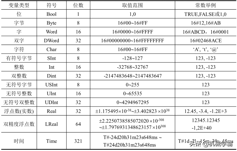 (1)整数:分为有符号和无符号整数,根据数据的长短可以分为8位的SInt短整数和USInt无符号短整数。16位的Int整数和UInt无符号整数。32位的DInt双整数和UDInt无符号的双整数。