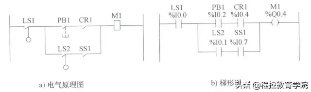 用梯形图符号编的PLC程序,很像电气原理图。如上图所示。图b为施耐德公司Naza PLC用的梯形图。