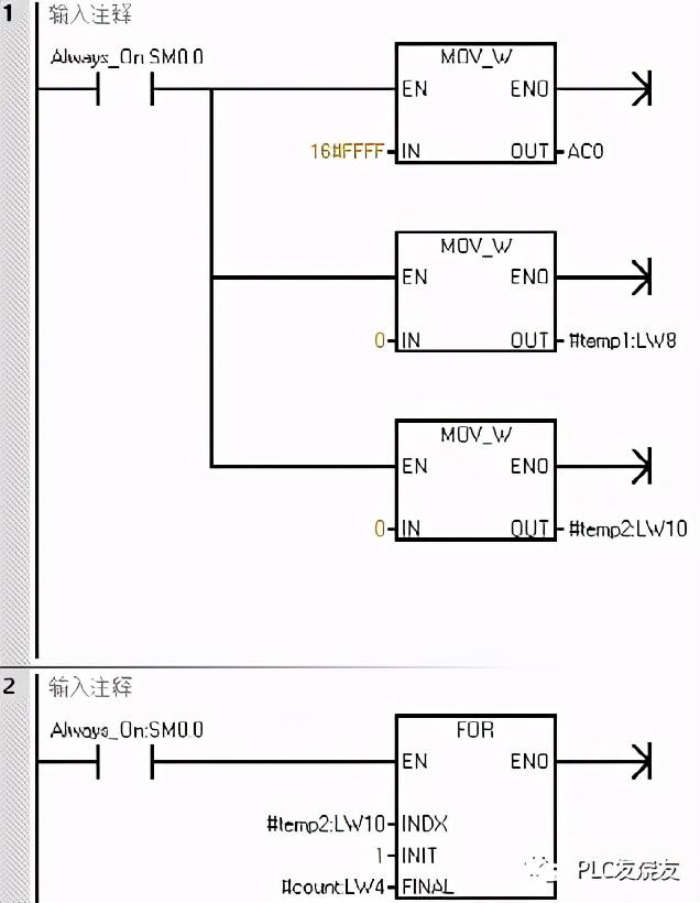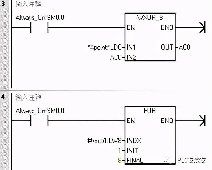 (1)“CRC校验程序”子程序,初始化存储器,并把16#FFFF装载到CRC寄存器中(定义AC0为CRC寄存器)。并利用FOR语句循环,循环的次数由LW4决定。程序如图1-1所示
