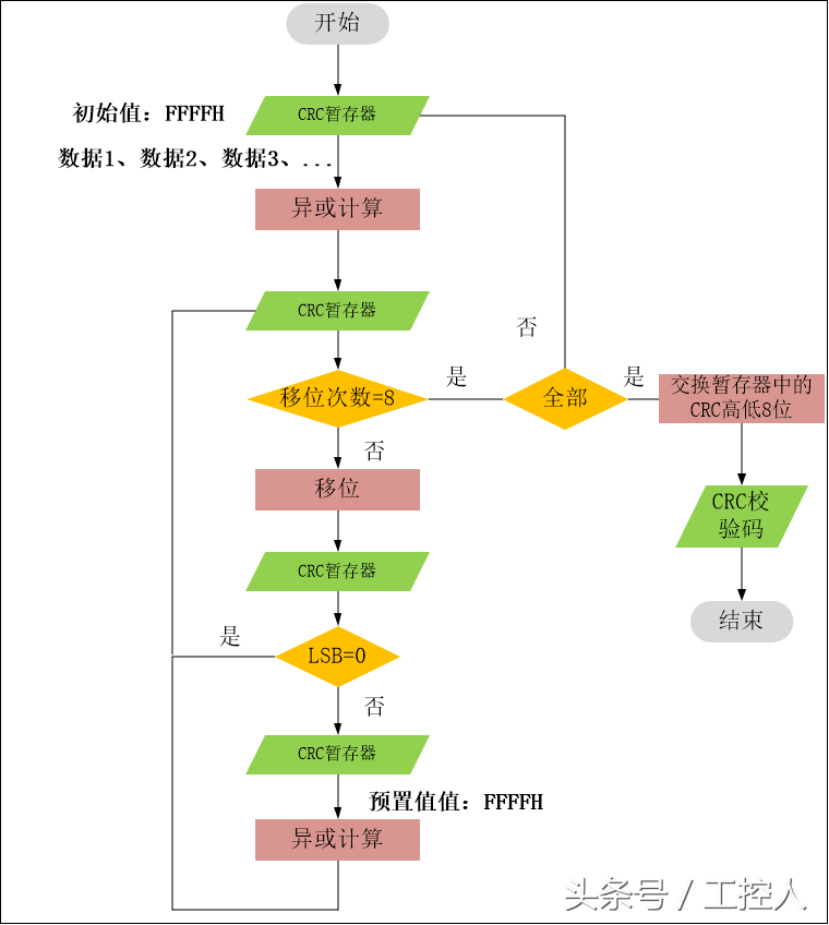 从上图中发现,有两个循环过程,即单个数据的CRC的计算,主要是对首个数据的CRC暂存器进行8次移位运算,另一个大循环是所有数据的运算(先运算完一个8位数据的CRC,下一个数据与这个CRC进行运算),这样把所有数据都计算完成后即可得到CRC校验码。