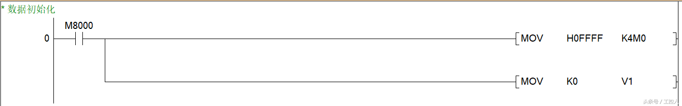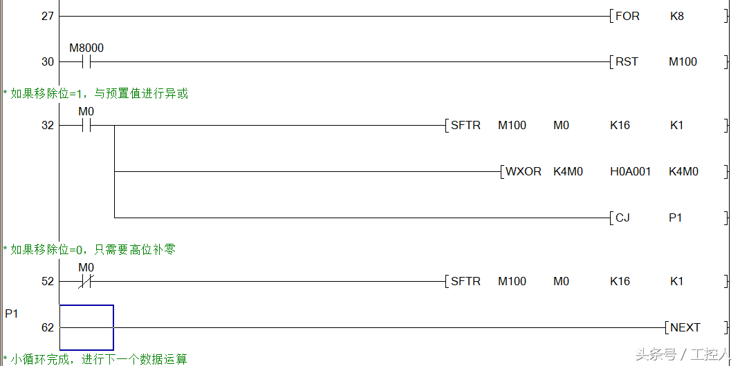 首先将M100复位是为了后面的高位补零用,SFTR指令是位右移指令,表示对M0为起始位置的16数据右移1位置,高位用M100填补即高位补零,低位M0为移除的溢出数据即LSB。如果LSB=1,则需要把移位后的数据与A001H进行异或计算,结果保存到CRC暂存器K4M0中,此时将覆盖原来的K4M0中的数据,在这里需要跳转指令CJ跳过LSB=0的情况。。如果LSB=0,只要把移位后的数据放入CRC暂存器中即可。