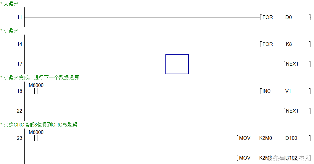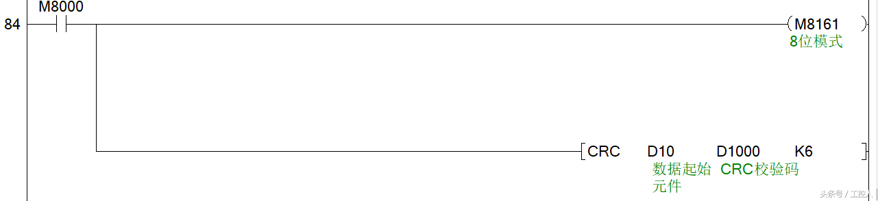 如果觉得麻烦,在FX3U中有现成的CRC计算指令CRC S D n,S代表要计算的数据的起始编号,D为CRC校验码保存的数据寄存器,n表示数据个数。