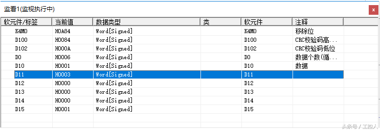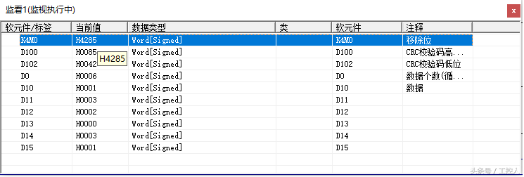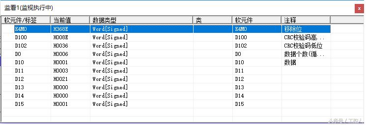 全部数据运算完成后,我们要对暂存器进行高低8位调换,将CRC校验码的高位存放到D100,低位存放发到D102中。至此CRC校验码计算完成。