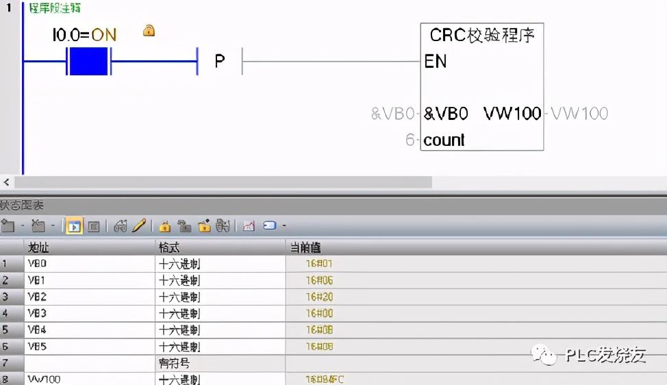 验证二: 写入数据到VB0至VB5中,CRC效验值存储在VW100中