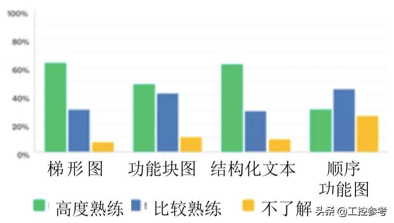 从调查的结果看,熟练掌握梯形图语言和结构化文本语言的比例较高,熟练掌握功能图语言次之,熟练掌握顺序功能图语言的比例较低。而不了解顺序功能图语言的比例最高。