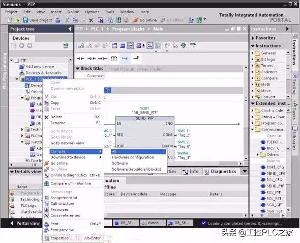 上面就完成了程序的编写,对项目进行编译;右击PLC_1项目在弹出的菜单里选择“Complies ALL”选项,这样就对硬件与软件进行编译,如下图: