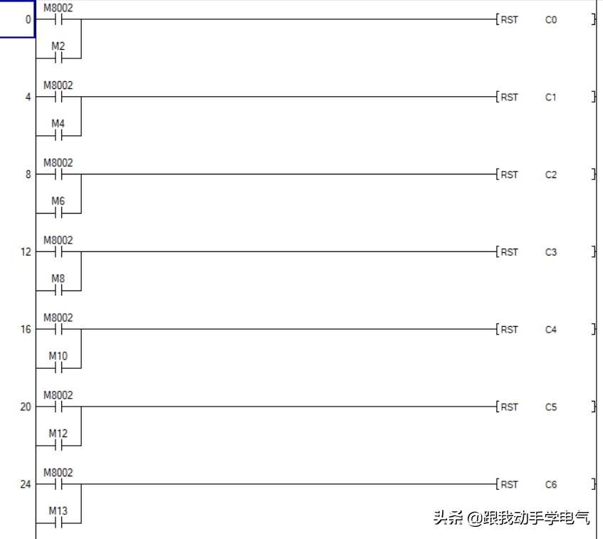 3.2.1、对计数器进行复位(分两种情况CPU初次启动和计数器执行完毕后),根据功能说明,照明控制分为6个时间段,在编程时就要用到6个计数器。程序如下:
