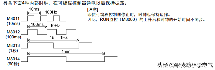 M8011、M8012、M8013和M8014分别是产生10ms、100ms 、1s和1min时钟脉冲的特殊辅助继电器。
