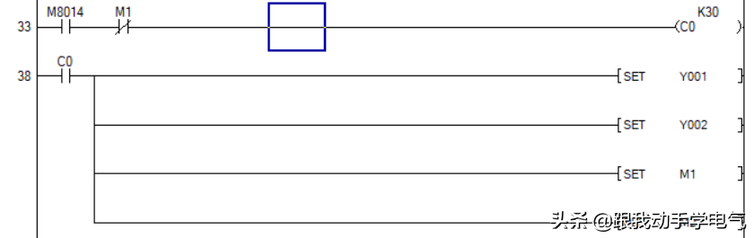 3.2.3 利用内部1分钟时钟脉冲M8014和计数器,在8点开三组照明,就是说计数器要计数30,就是30分钟。