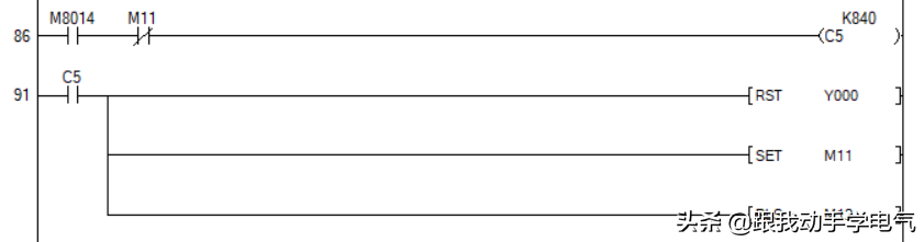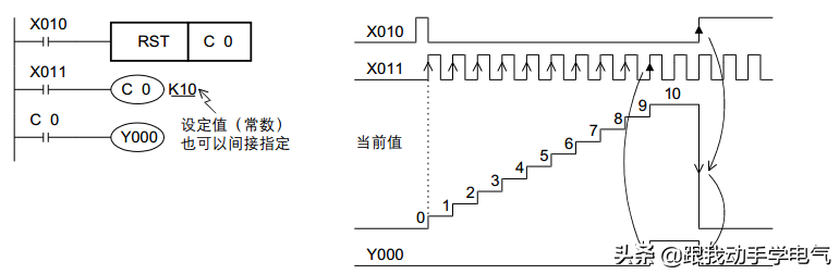 在上图的例子中,当X011每动作一次,驱动C0线圈一次,计数器C0当前值加1,当加到第10次执行线圈指令的时候输出触点动作,也就是Y0得电。但要注意的是,在加到10次之后,即使X011动作,但是计数器的当前值不会变化。