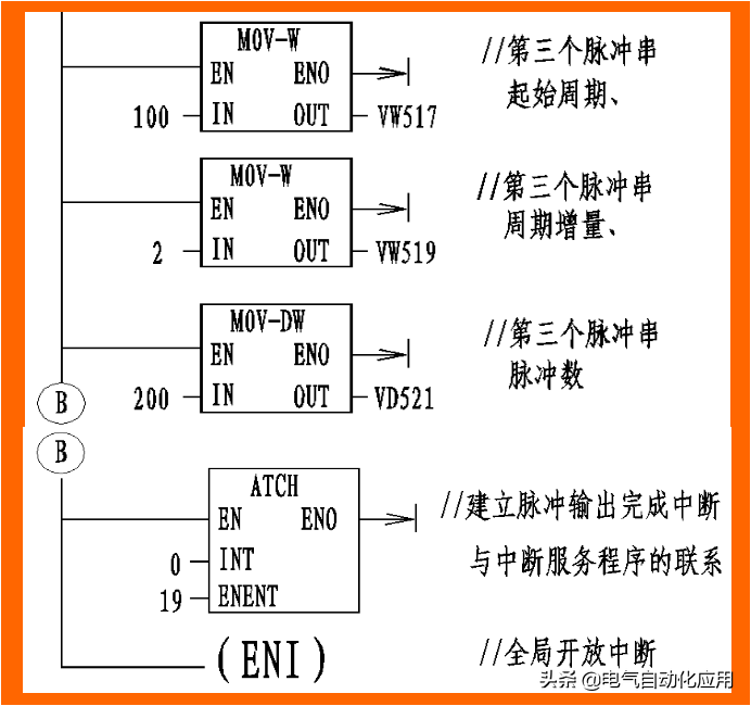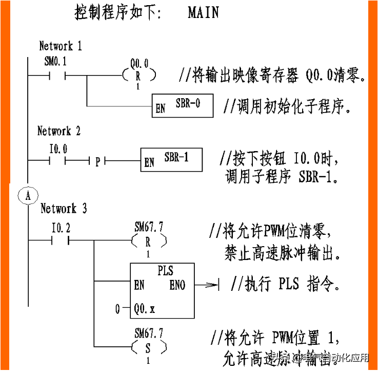 建立中断连接:用ATCH指令建立脉冲输出完成中断事件与中断程序的联系。当PLS指令输出完指定数量的脉冲串时,产生中断。